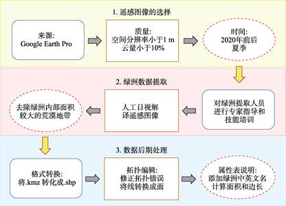 尽管当前已有研究提出半自动[14,15]或全自动[16,17]的地物提取方法,但这些技术在应对绿洲内部植被类型的空间异质性(如不同作物类型、灌木与乔木的混合分布)以及绿洲边界模式的形态多样性时(如河流边缘的渐变过渡带、农田与荒漠的交错带等复杂场景),仍存在分类精度不稳定、边界模糊等问题。为确保绿洲边界数据的一致性与高质量,最终选择了目视解译方法为主[18],结合地理信息系统的空间校验,构建了严谨的技术流程(图1)。首先,选择2020年夏季遥感图像。因为该时期绿洲内部植被生长茂盛,叶面积指数较高,且无积雪干扰,为目视解译提供了高对比度的视觉基础。其次,通过Google Earth Pro平台对影像进行多级缩放,要求为视角海拔高度低于1.5 km,空间分辨率优于1 m,以清晰呈现绿洲边缘的细节特征(如植被树冠形态、农田边界等)。接着,根据实际地面情况,以植被覆盖数据为辅助,对不同土地利用类型(如水体、裸地、农田、荒漠)进行逐像元判读,利用平台测绘工具精确设置控制点,并将绿洲边界以.kmz格式导出。随后,将.kmz文件导入到ArcGIS10.8中,转换为.shp格式的矢量文件后,执行空间拓扑关系检查。最后,将校验后的折线型(polyline)边界数据转换为面状(polygon)多边形文件,在属性表中补充基础地理信息,并剔除面积小于0.01 km2的微小斑块,以消除噪声干扰,更精准地表征绿洲的整体空间范围与地理特征。