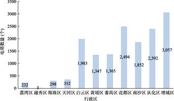 空间分析过程首先需要收集来自开源地图数据库OpenStreetMap的研究区内所有高压电塔,其空间分布如图4。广州市境内共有15,375个高压电塔,将各区的电塔数据与行政区划数据叠加,统计得到各区的电塔数量如图5所示,各区间电塔数量差异较大。各行政区所处位置不同、面积大小不同、土地利用方式不同,造成了电塔数量的差异:市中心的行政区本身面积小,且地下电缆铺设较为完善,对地面电塔的需求较低;外围区县的面积较大,需要更多电塔覆盖大面积地区来保障供电。