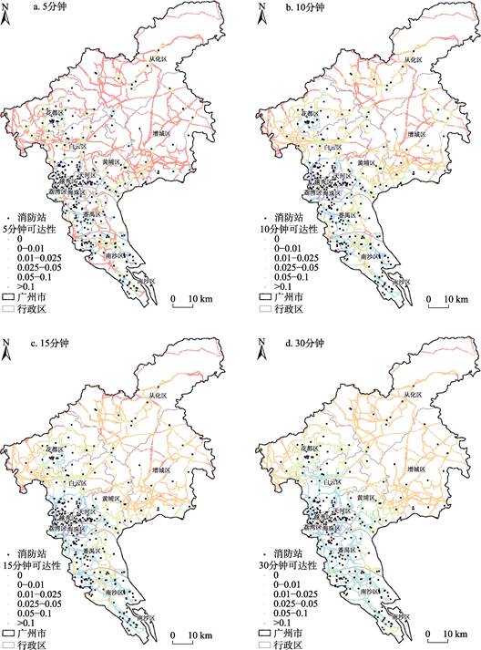 可达性是指人们克服距离或时间等阻力、到达服务设施或活动场所的难易程度或期望程度的定量表达[26]。时间可达性主要考虑供给方到需求方的行程时间,空间可达性强调供给方和需求方之间的空间关系。网络分析法和两步移动搜索法是计算可达性最常见的方法[27]。网络分析最近设施法计算行程时间仅从供给角度研究单个消防站何时能够到达高压电塔;两步移动搜索法则是综合考虑了供给和需求两方面,计算一旦高压电塔同时发生事故时高压电塔可获得的消防站数量[28]。