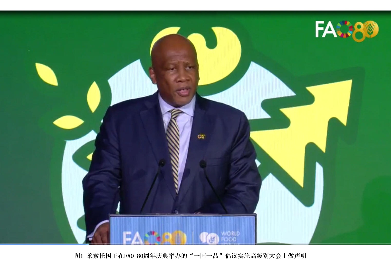在联合国粮农组织成立80周年之际,粮农组织在总部罗马举办了一系列纪念活动,其中包括“一国一品”倡议实施高级别大会。在这个大会上,莱索托国王莱齐耶三世