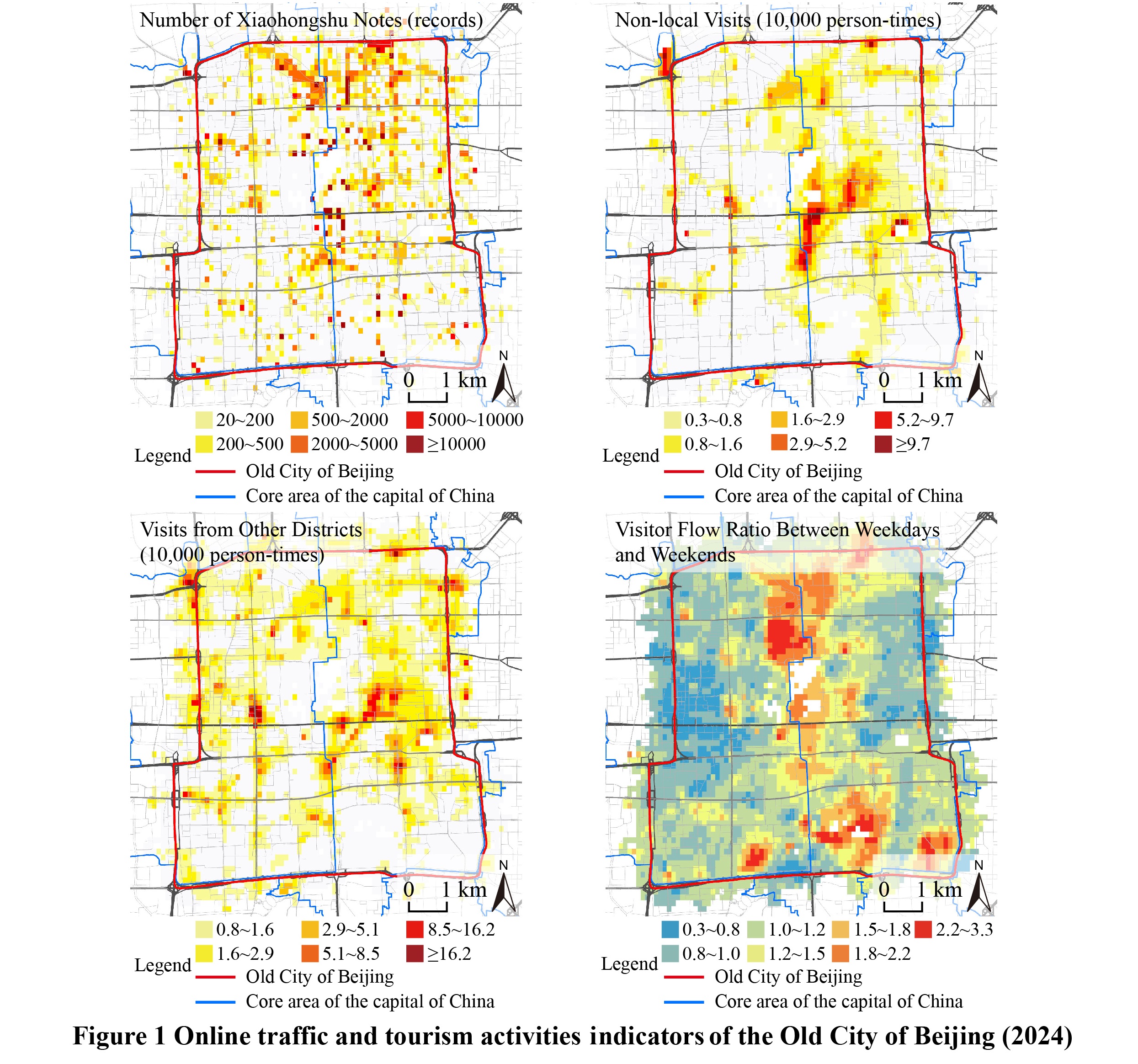 Online traffic-driven tourism activities may exert profound impacts on urban operation. Based on mobile phone signaling data and geographic tag data from ” “Xiaohongshu” system, the authors extracted internet-famous tourism indicators within the 15-minute accessible range of residents' residences in the Old City of Beijing. The note number from“Xiaohongshu” system with geographic tags was used to characterize online traffic, the number of non-local visits to represent long-distance sightseeing tourism activities, and the number of visits from other districts in the city as well as the ratio of weekend-to-weekday passenger amount to denote short-distance leisure tourism activities. These indicators were aggregated into Geohash Level 7 grids to form the dataset of online traffic and tourism activities indicators of the Old City of Beijing (2024). The dataset includes: (1) boundary data of the Old City of Beijing and the core functional area of the capital; (2) cross-sectional note data from the “Xiaohongshu” system in June 2024; (3) the number of non-local visitors, the number of visitors from other districts, and the ratio of weekend-to-weekday passenger amount for March, June, September, and December 2024; (4) Geohash Level 7 grid data within the Third Ring Road of Beijing. The dataset is archived in .shp and .xlsx formats, consisting of 25 data files with data size of 3.76 MB (compressed into one single file with 581 KB). The analysis paper based on the dataset was published in Acta Geographica Sinica, Vol. 81, No. 2, 2026.