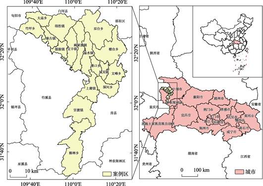 案例区为竹山县(图1),隶属湖北省十堰市,地处东经109°32′–110°25′、北纬31°30′–32°37′之间,东邻房县,北接郧阳区,西北陕西省白河县,西交竹溪县、陕西旬阳市,南接神农架林区、重庆市巫溪县。县城东北距十堰市城区158 km,东南距武汉市638 km。总面积3,586 km2