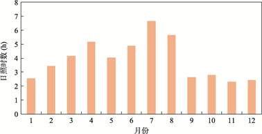 竹山县四季分明,雨热同季,全县多年平均年降水量958.5 mm,降水集中在310月份,占全年降水量的92%(图6)。除了7月份之外,全年其他月平均每日的日照时数低于6 h(图7),多年平均年日照时数为1,428 h,有利于喜阴的茶树发生光合作用。