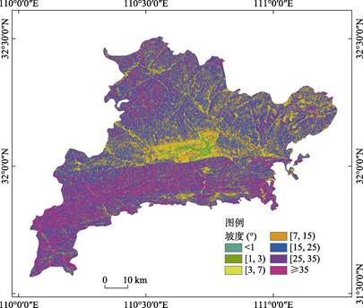 房县地形坡度呈现中间低、四周高的地貌特征,整体地势由中部河谷平原向周边山地逐渐抬升。这种地形格局主要受秦巴山区构造运动和汉江水系长期侵蚀切割的影响,形成了以房县盆地为中心、四周被中低山环绕的“盆状”地貌结构。中部地势相对平坦,坡度基本在15°以下(表3和图3),是县域内主要的城镇聚集区和农业耕作区;四周多为15°以上的山地,森林覆盖率高。