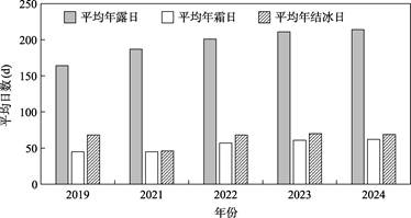 势,从2019年的164 d增加至2024年的205 d,增长速率为5.48%。与露日数的持续增长不同,霜期序列较为稳定,2019年和2021年均为45