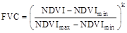 where FVC is the FVC of the target pixel, and NDVI is the corresponding NDVI; k is the non-linear exponent and NDVImax and NDVImin are the NDVI of pure vegetation and bare soil, respectively. These coefficients are difficult to obtain accurately because of the influence of soil, vegetation type, chlorophyll content, and other factors. Nevertheless, they can be determined through statistical analysis of spatial and temporal NDVI data[2]. For