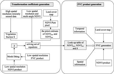 The algorithm calculates NDVI-to-FVC transformation coefficients by combining the existing remotely sensed data and datasets. First, the representative pure pixels were obtained by combining the land cover map and vegetation regionalization map. Then, the prior estimates of NDVImax and NDVImin were determined through statistical analysis of the coarse-resolution NDVI dataset based on the pure pixels. The nonlinear coefficient k was acquired by model-fitting using existing FVC and the coarse-resolution NDVI dataset. Based on the prior estimates of NDVImax and NDVImin, the nonlinear coefficient k, the NDVI-to-FVC transformation coefficients for different vegetation zones, and land cover types were calculated through solving the established equations.