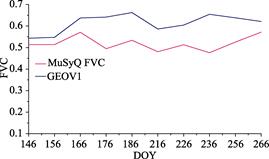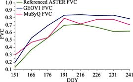 For the Heihe data, we compared three FVC datasets. First, the empirical relationship between ASTER NDVI and FVC measurements was established by empirical regression to acquire the ASTER FVC. Then, referenced ASTER FVC was obtained by scaling up the ASTER FVC to 1 km resolution. Finally, the averaged FVC of the referenced ASTER FVC, the fraction of green vegetation cover product (i.e., GEOV1 FVC) derived from SPOT/VEGETATION data during the GEOLAND2 project, and the retrieved FVC (i.e., MuSyQ FVC) were calculated to obtain the FVC time series (Figure 4). Figure 4 shows that the MuSyQ FVC time series lies between the two curves of referenced ASTER FVC and GEOV1. This indicates that the FVC retrieved from the proposed algorithm is superior to the GEOV1 FVC dataset.