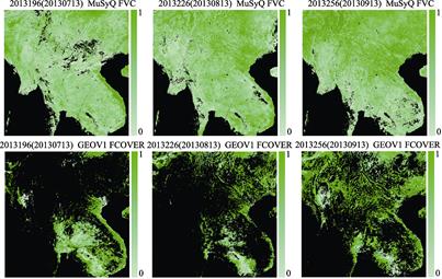The spatial and temporal continuity of MuSyQ FVC was obviously superior to that of GEOV1 FVC. Even when affected by massive clouds and rain, the effective area of MuSyQ FVC was double as large as that of the area of GEOV1 FVC during several time periods in the summer of 2013, especially in Laos, Myanmar, and Thailand. However, the time-series values of MuSyQ FVC fluctuated over these phases. This might be due to the quality reduction of MuSyQ FVC induced by the clouds, rains, and the quality of the MuSyQ NDVI product.