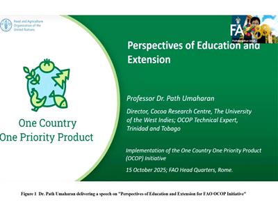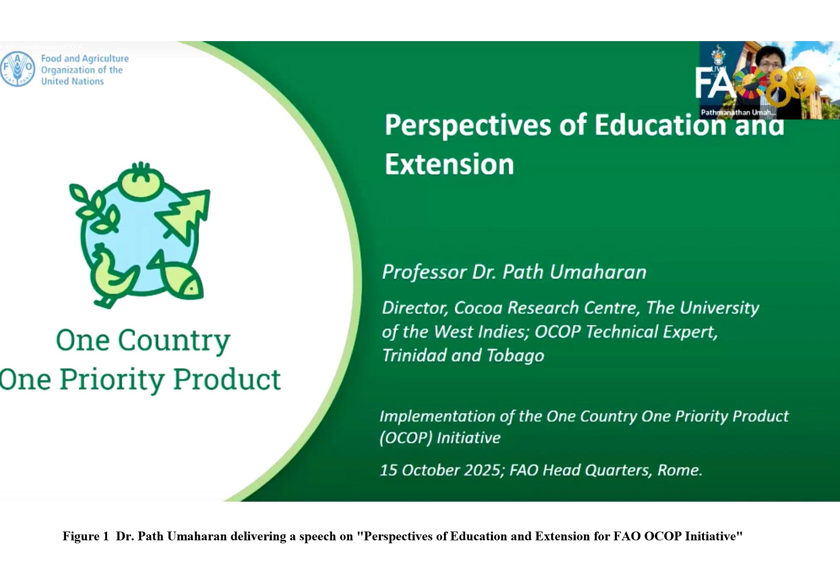 Trinidad and Tobago has a 500-year legacy in cocoa production, which ranks the third producers of the world, it has the International Cocoa Gene Bank. The Cocoa Research Center has been in existence for 95 years. The University of the West Indies, which is a regional university, supports 15 countries in the Caribbean Region. The engagement of OCOP Initiative in Cocoa Research Center of the University of the West Indies in Trinidad and Tobago include master cases and technology incubation to support the emergence of value-add SMEs; business incubation to improve business management; apprenticeship training to support farm skill development; train-the trainer program to support technology transfer to improve productivities and sustainability and digital products, e-learning platform, famer interaction support app, digital traceability system, e-market place and famer-scientist cooperation. The video lasts 8:57 minutes, and it is archived in .mp4 format with data size of 426 MB. The text version of the video will be published at the Journal of Global Change Data & Discovery, Vol. 10, No. 1, 2026.