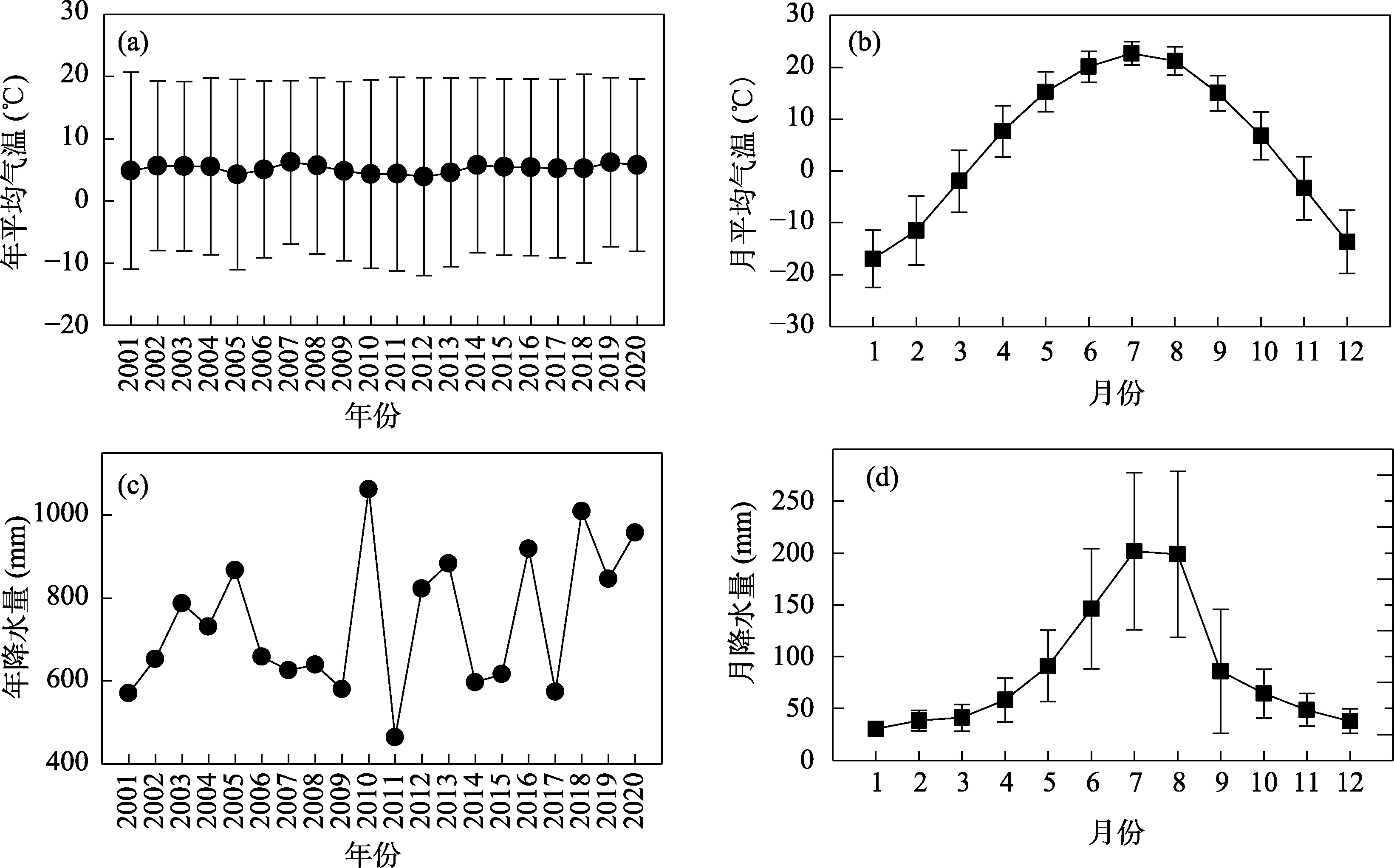 磐石地处中温带、湿润区,为具有大陆性的季风气候[1–3]。2001‒2020年气象数据显示(图3),年均温为5.2 ℃,1月为最冷月份,平均为‒16.9℃;7月为最热月份,平均22.7℃。年均降水量为743 mm,降雨主要集中在6–8月份,占全年降水量的60%以上。夏季自然降雨充沛,气温舒适,适宜开展休闲垂钓。严冬之际,水库、塘坝均有超过20天的冰封期,适宜开展冬捕活动。
