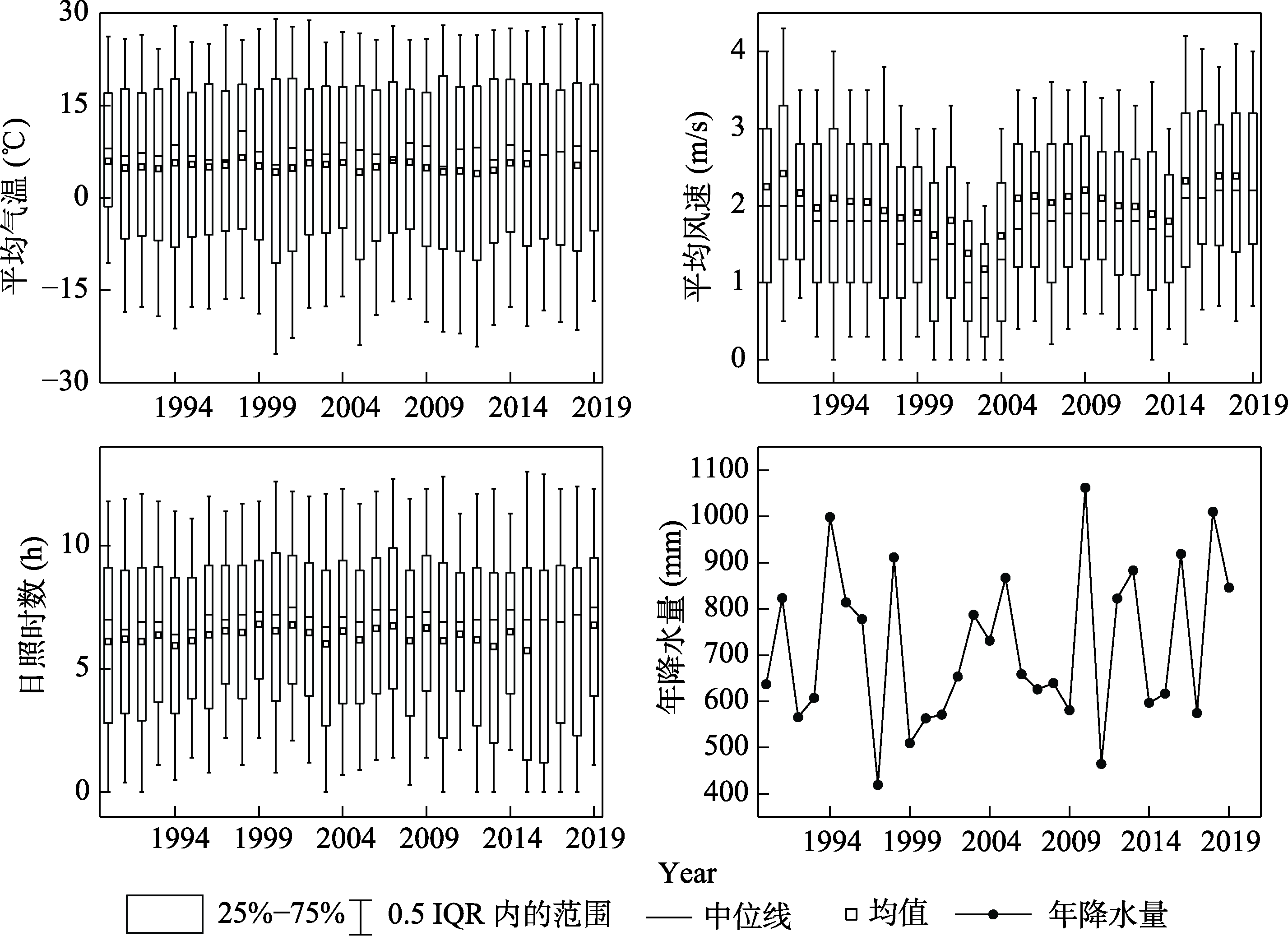 本部分所用数据来自国家气象数据中心的中国地面气象日值数据集[1]。分析表明,富太镇为温带大陆性季风气候,四季分明,春季干燥且多大风,夏季炎热多雨,秋季凉爽晴朗,冬季漫长寒冷。研究区年均温为5.20 ℃,无霜期约130天,4-10月大于0 ℃的积温为1,972.9 ℃。年平均降水量为723.4 mm,其中5-9月为雨季,降水量达576.8 mm,日平均相对湿度达69.05%。年平均风速为1.99 m/s。平均日照时数为6.35 h,年日照时数达2,318.27 h(图2)。