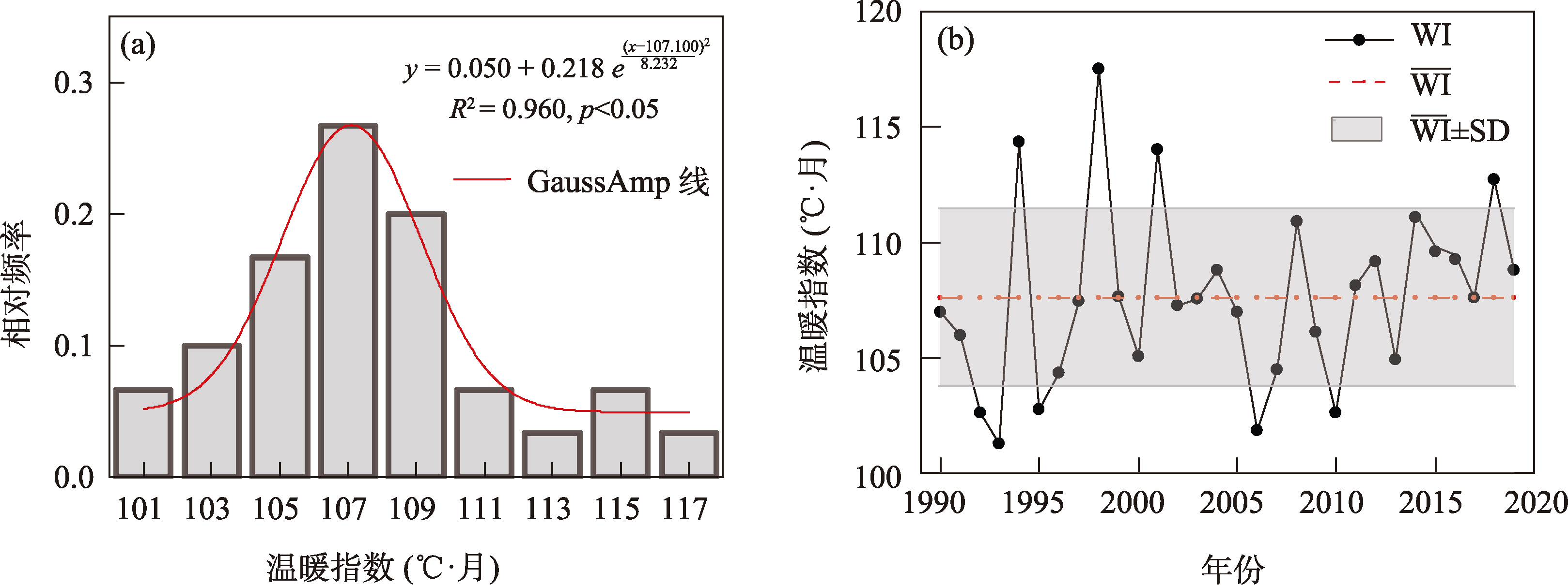 图3 1990-2019年富太镇温暖指数频率分布(a)和年际变化(b)