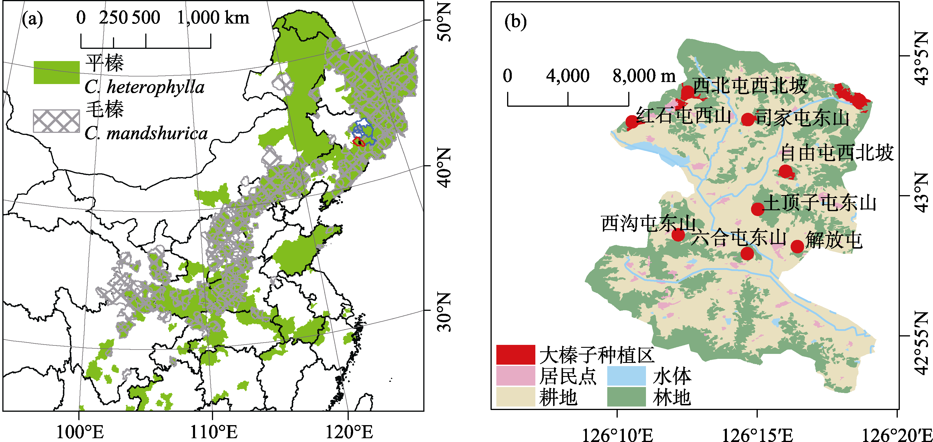 图6 中国平榛、毛榛自然分布范围 (a) 与富太镇平欧榛人工种植范围 (b)