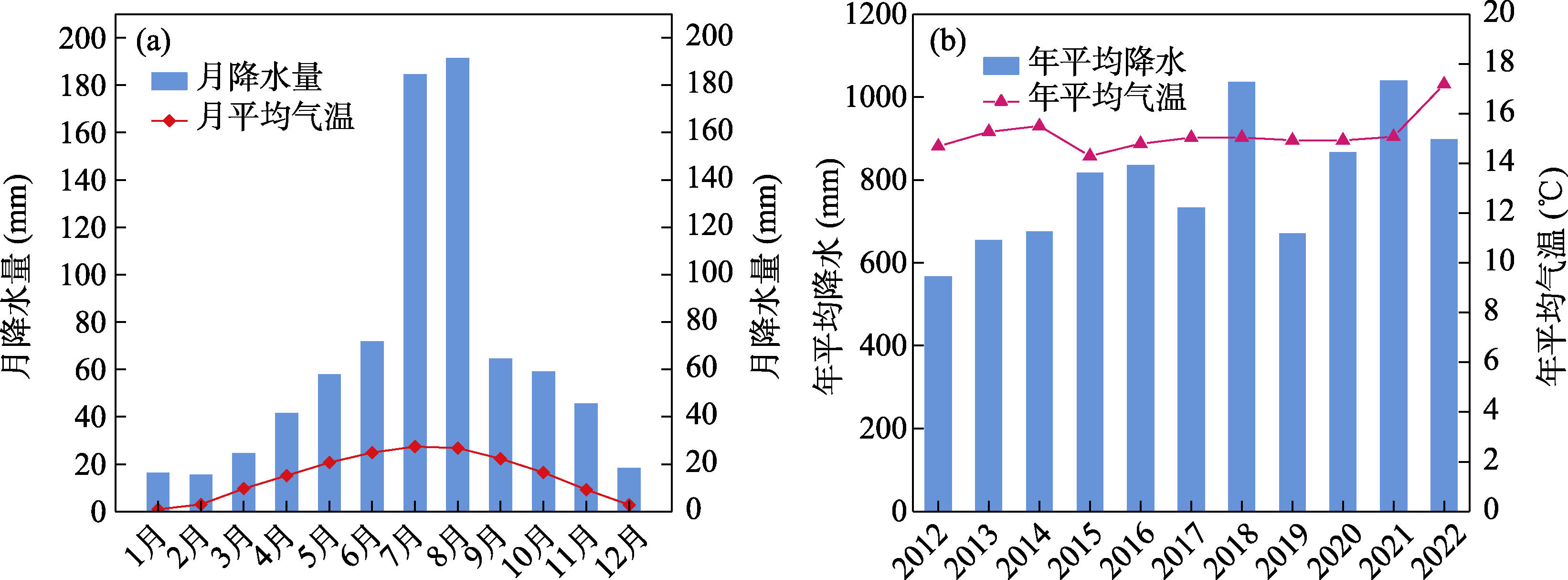 丰县为暖温带半湿润季风气候区,四季分明,光照充足,是江苏气温最低、降水最少的一个县[16]。丰县年平均气温15 ℃,年平均降水量在630.4 mm,雨热同季(图2),无霜期达210天。2012-2022年,丰县年平均气温没有明显变化,年降水量呈现出上升趋势(图2)。