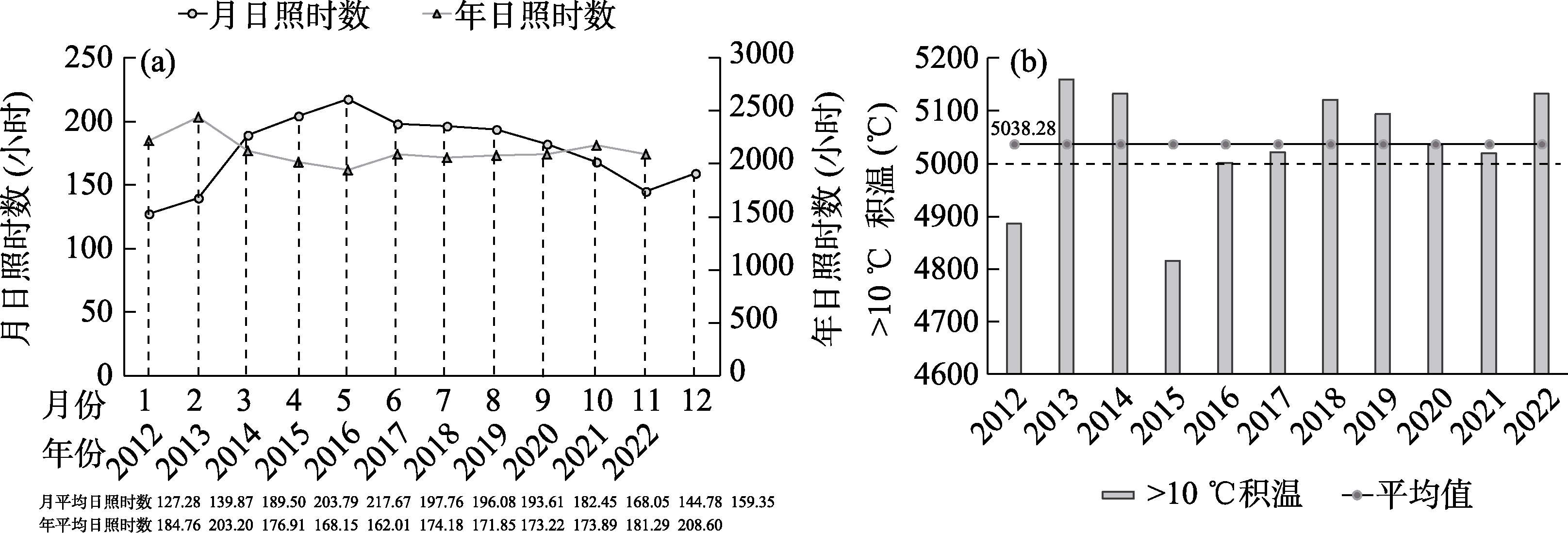 2012-2022年,丰县日照时数较长,月均日照时数为177小时,日照最强的月份集中在4-6月(图3)。2012-2022年案例区≥10℃年积温平均值为5,038 ℃,只有2012和2015年两年未超过5,000 ℃,其余年份均大于5,000 ℃,光照条件良好,适宜梨树的生长。