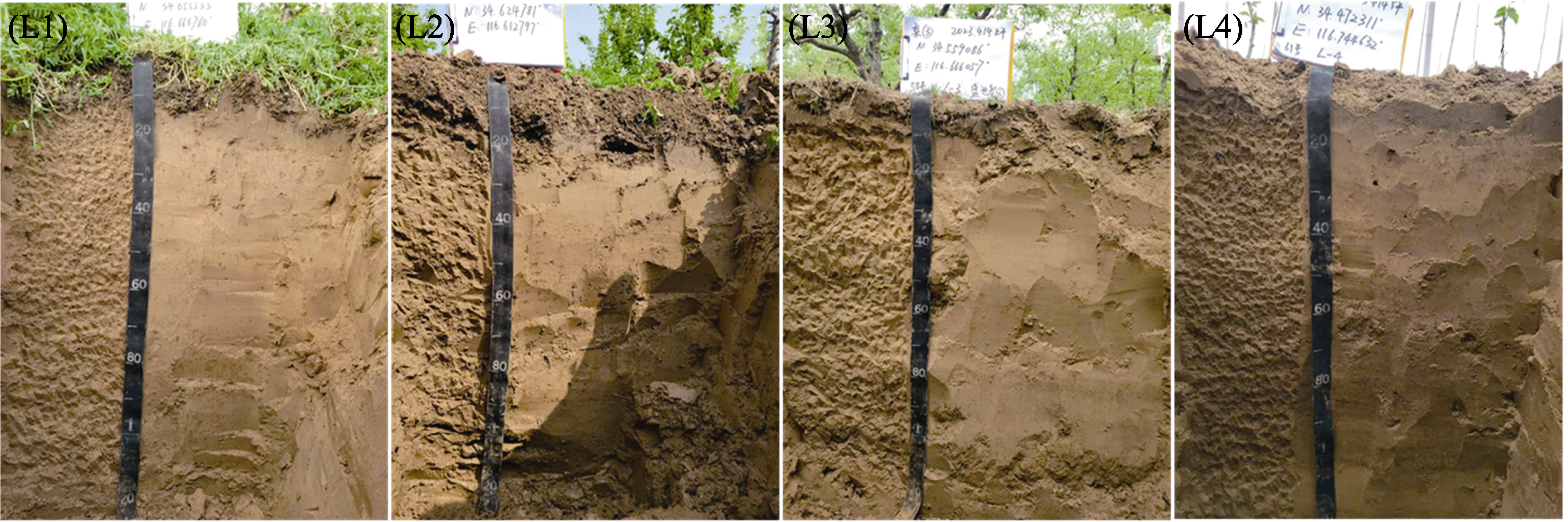 土壤剖面记录着土壤在成土因素的影响下,可能发生过的和正在进行着的各种成土作用。为了探究古黄泛区深层土壤条件,本研究在4个乡镇(华山镇、宋楼镇、大沙河镇和梁寨镇)各布设了1个土壤剖面采样点位(图6)。土壤剖面的规格为长1.2 m、宽1.0 m、深1.2 m,挖掘土壤剖面要使观察面向阳,表土和底土分两侧放置。剖面整体上要修理平整,挑出部分毛面,避免明显刀痕,按照要求记录剖面照片、景观照片和特征照片(图7)。每个剖面分层采集土壤样品,每层间隔20 cm,共6层土壤样品,每层样品采集1 kg,装入样品袋,由专人做好记录。通过土壤样品分层采集,检测梨树种植区域深层土壤的肥力条件,检测项目包括pH、阳离子交换量、有机质、全氮、有效磷和速效钾。