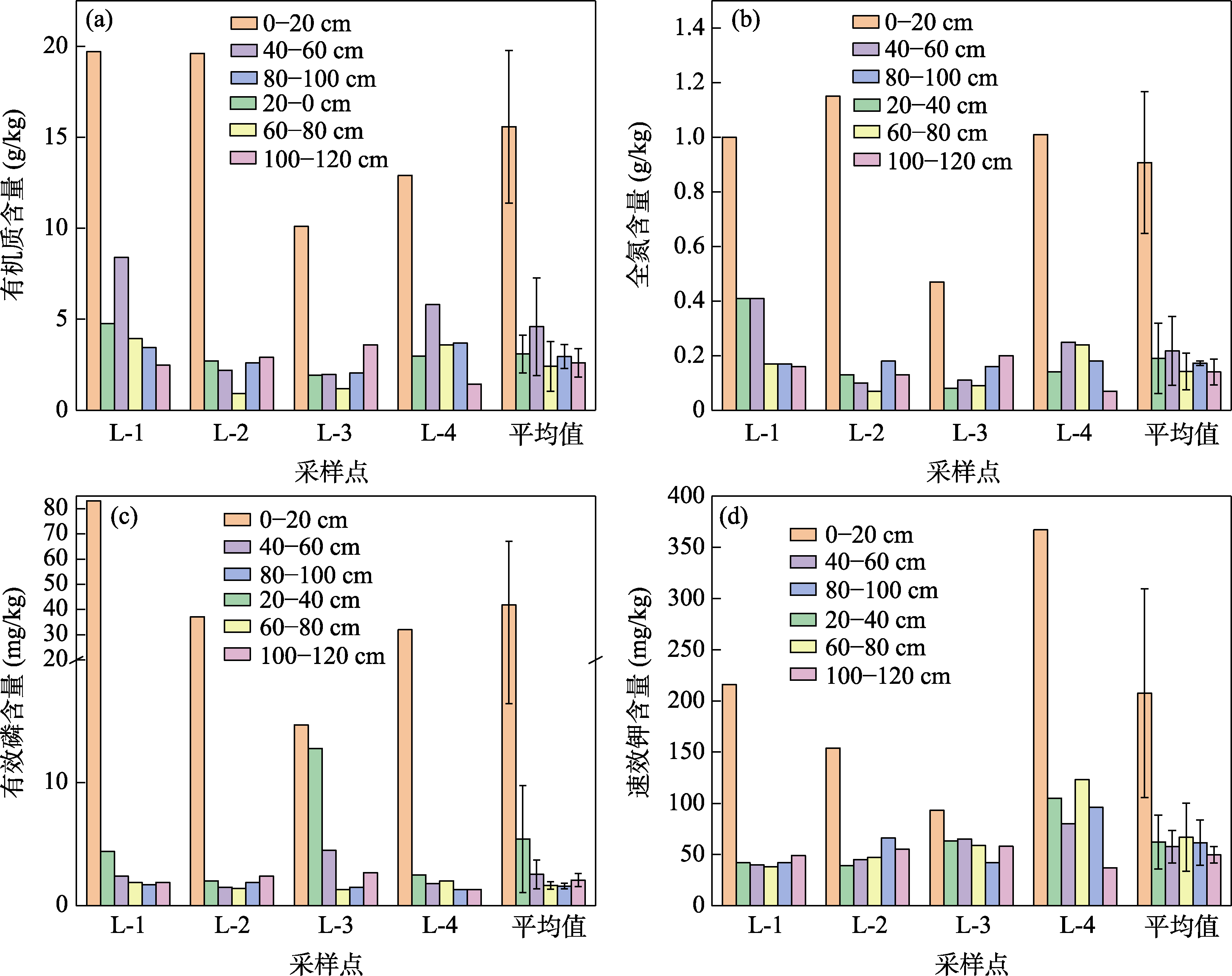 不同土层土壤肥力指标检测结果如图8所示。从不同点位的情况来看,0-20 cm表层土壤的有机质含量最高,达到10.10-19.70 g/kg,平均值为15.58 g/kg(图8a),养分含量中等。随土层深度增加,土壤有机质含量有两种变化趋势:(1)先减小后增加(L2和L3点位),其中60-80 cm土层土壤有机质含量最低,仅为0.91-3.95 g/kg;(2)先减小后增加再减小(L1和L4点位),其中20-40 cm土层和60-120 cm土层土壤有机质含量低于40-60 cm土层。土壤全氮含量的变化趋势与土壤有机质基本相同(图8b)。在不同土层中,0-20 cm表层土壤有效磷含量最高,平均值为41.78 mg/kg(图8c),养分含量丰富;其次是20-40 cm土层;40-120 cm深层土壤有效磷含量呈现先减小后增加的趋势,但变化幅度较小。此外,0-20 cm表层土壤中的速效钾含量最高,平均值为207.5 mg/kg(图8d),养分含量丰富;20-120 cm土层土壤速效钾含量变化幅度较小,且无明显变化规律,养分含量中等。
