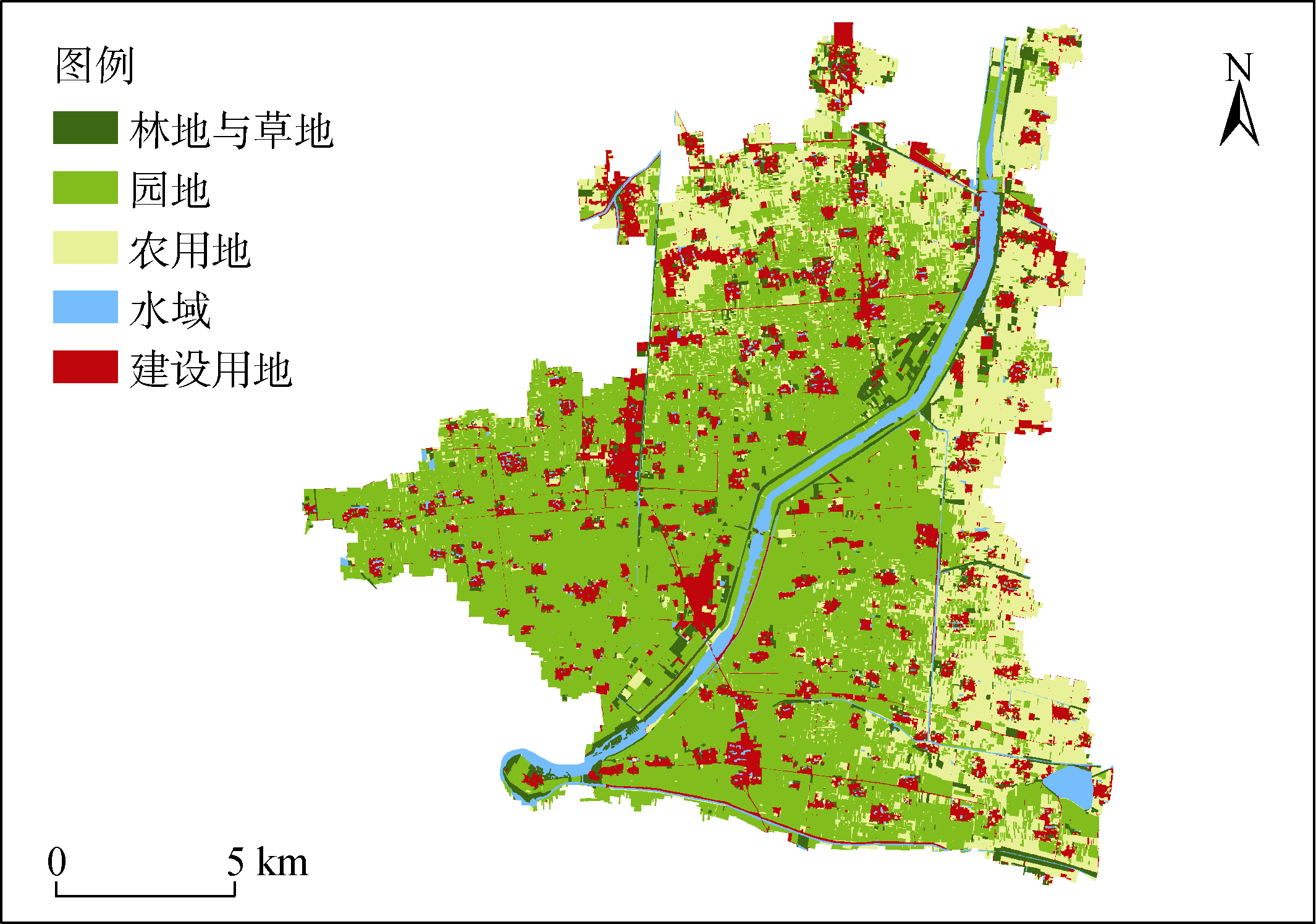 丰县土地肥沃,物产丰饶[21],享有“丰熟可抵三州”的美誉。丰县梨主产区土地利用类型包括园地、农用地、建设用地、水域以及生态用地(图9)。其中,园地面积最大,是主要的用地类型,其次为农用地和建设用地;农用地主要分布在梨产区的北部和东部,建设用地主要为农村居民点,均匀地分布梨种植区各个方位。最后,梨生产区还有一定数量的林地和草地,形成了多样的生态系统,为梨的生产创造了良好的生态环境。