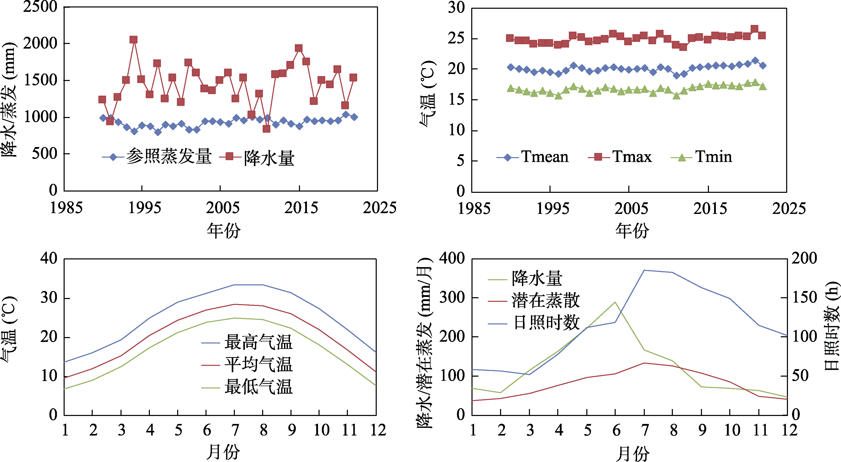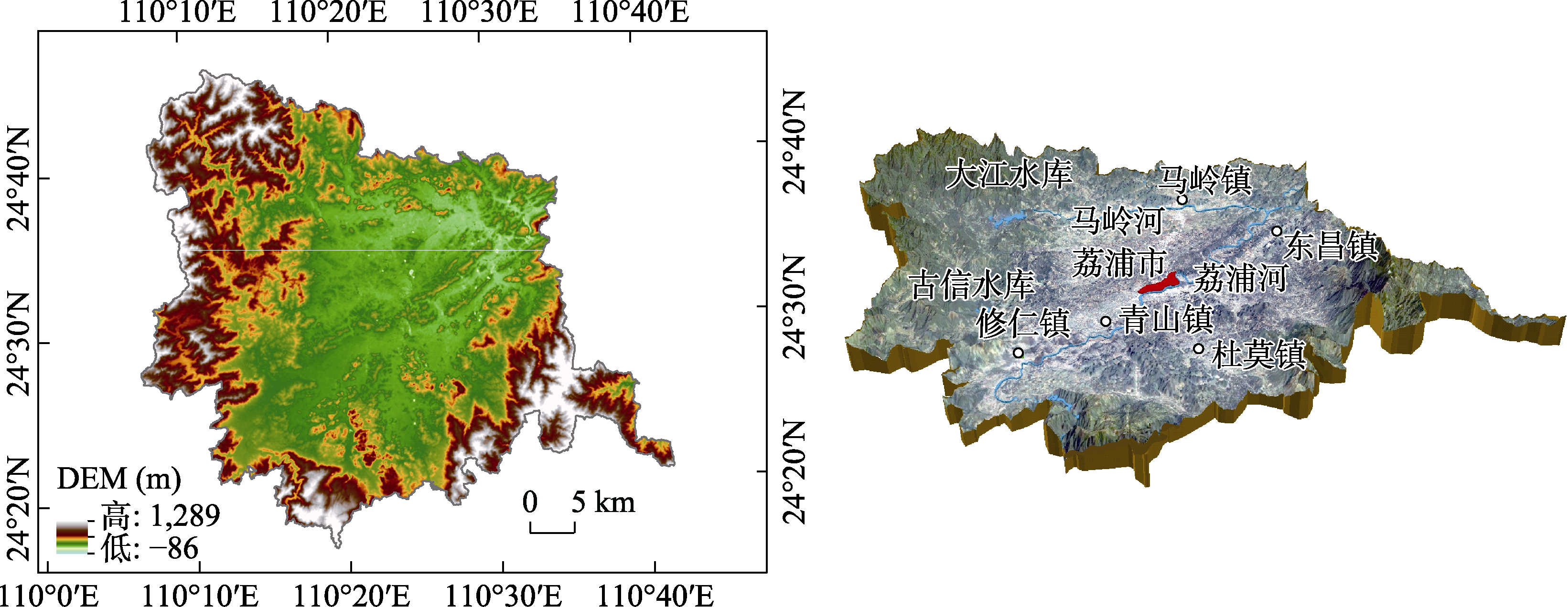 案例区荔浦市地处北回归线北侧,属南亚热带湿润气候区,四季分明,气候温暖,热量充足,降水丰沛。多年平均气温为19.8 ℃,最热月份(7月)和最冷月份(1月)的平均气温分别为28.4±0.9 ℃和9.5±1.6 ℃,平均年总积温7,181.5 ℃(县志),其中≥10 ℃的活动积温为3,454 ℃(S(T–10))。平原区气温稍高,暖温中心在新坪乡附近;低温中心在边缘山巅。该区光照充足,年平均日照时数达1,536.6小时,平均年太阳总辐射为4,021.58 MJžm–2,夏季日照时数占全年日照时数的32%,冬季仅占15%。案例区无霜期大于310天,其中≥10℃的天数约为290天。荔浦县年平均降雨量1,397 mm,雨量集中在4~8月,占全年雨量的68.3%。境内周围山区的降水多于中央平原丘陵区,雨日数多,平均每两天有一次小雨,每9天有一次中雨,每25天有一次大雨。年平均相对湿度79%,春季潮湿(空气相对湿度达82%),10月较干(相对湿度为74%),年平均参考作物蒸散量为930 mm,旱情主要发生于秋季。随着全球气候变化的持续加强,特大干旱、持续性强降雨等极端天气气候事件发生的频率增加,破坏程度加大,灾害损失和影响也愈趋严重。
