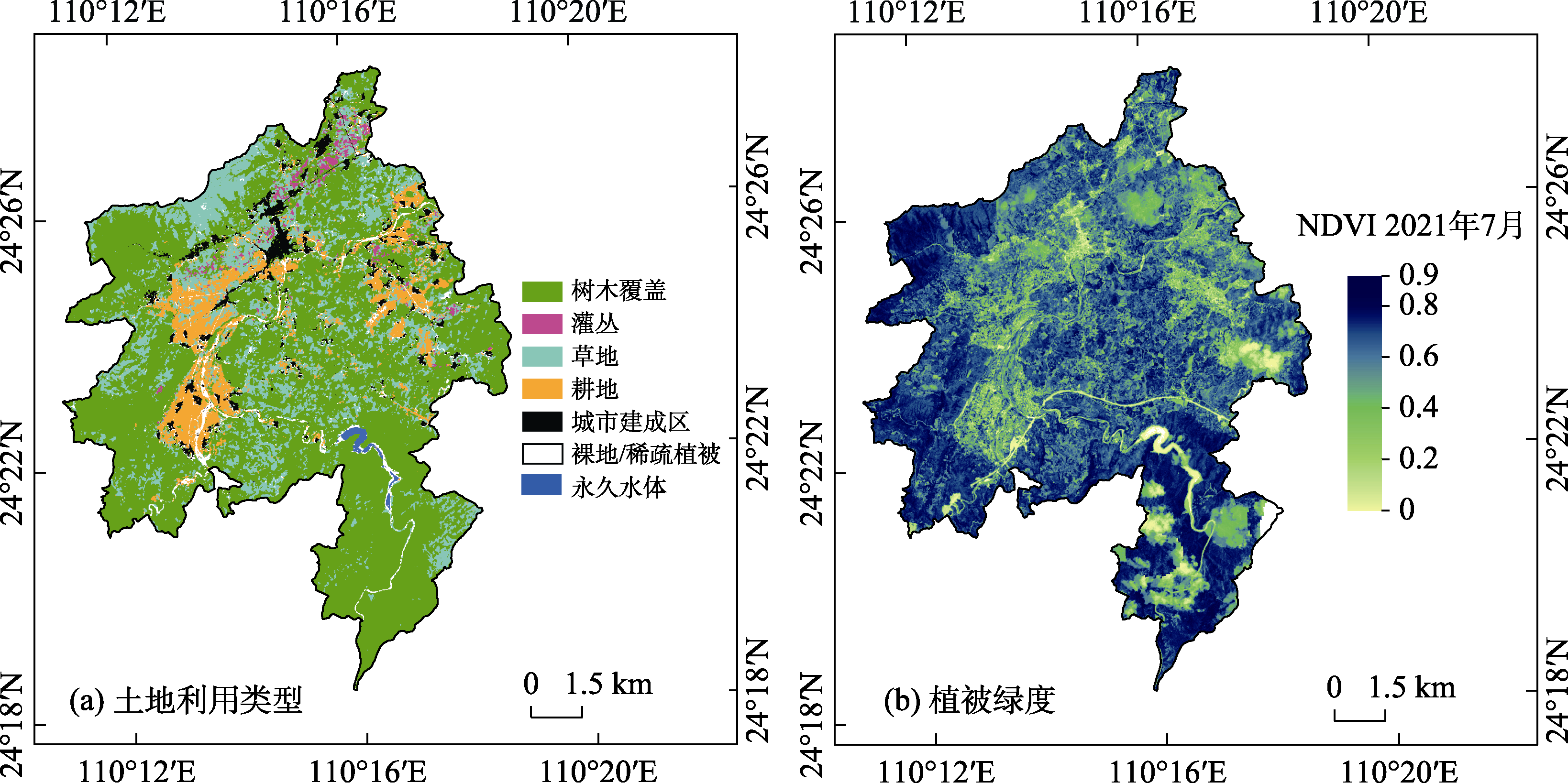 荔浦市1960年代森林资源遭受极大破坏,1980年代开始封山育林,到1990年代末,全市有林面积恢复到6.512万hm2,基本接近于1950年代初期的水平。1990年代末全县森林覆盖率为66.9%。2000–2018年MODIS遥感数据的分析结果表明,荔浦市植被整体得到恢复,显著改善的面积占比为69.5%[8],自然生态环境整体状况明显改善。根据Sentinel 2卫星遥感影像识别的2020年土地利用图显示,修仁镇的土地利用类型以森林、草地和水田为主, 其面积分别为76.97 km2(64.21%)、23.2 km2(19.32%)和10.2 km2(8.49%)。修仁镇植被绿度的季节差异不明显,2月绿度较低,6月绿度最高。
