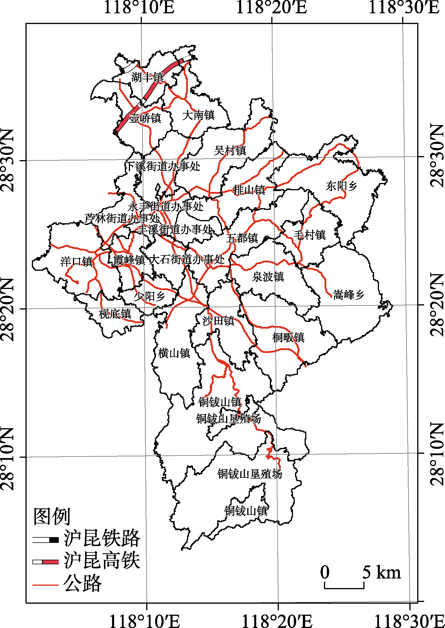 在交通网络方面,沪昆铁路,沪昆(京福)高铁穿过广丰境内;区内现有1条过境高速公路(沪昆高速),1条国道(320国道)公路,2条省道(二上线和玉广线)公路,11条县道等,公路总里程达到1,791.39 km。广丰区行政区划与交通网络分布如图2所示。
