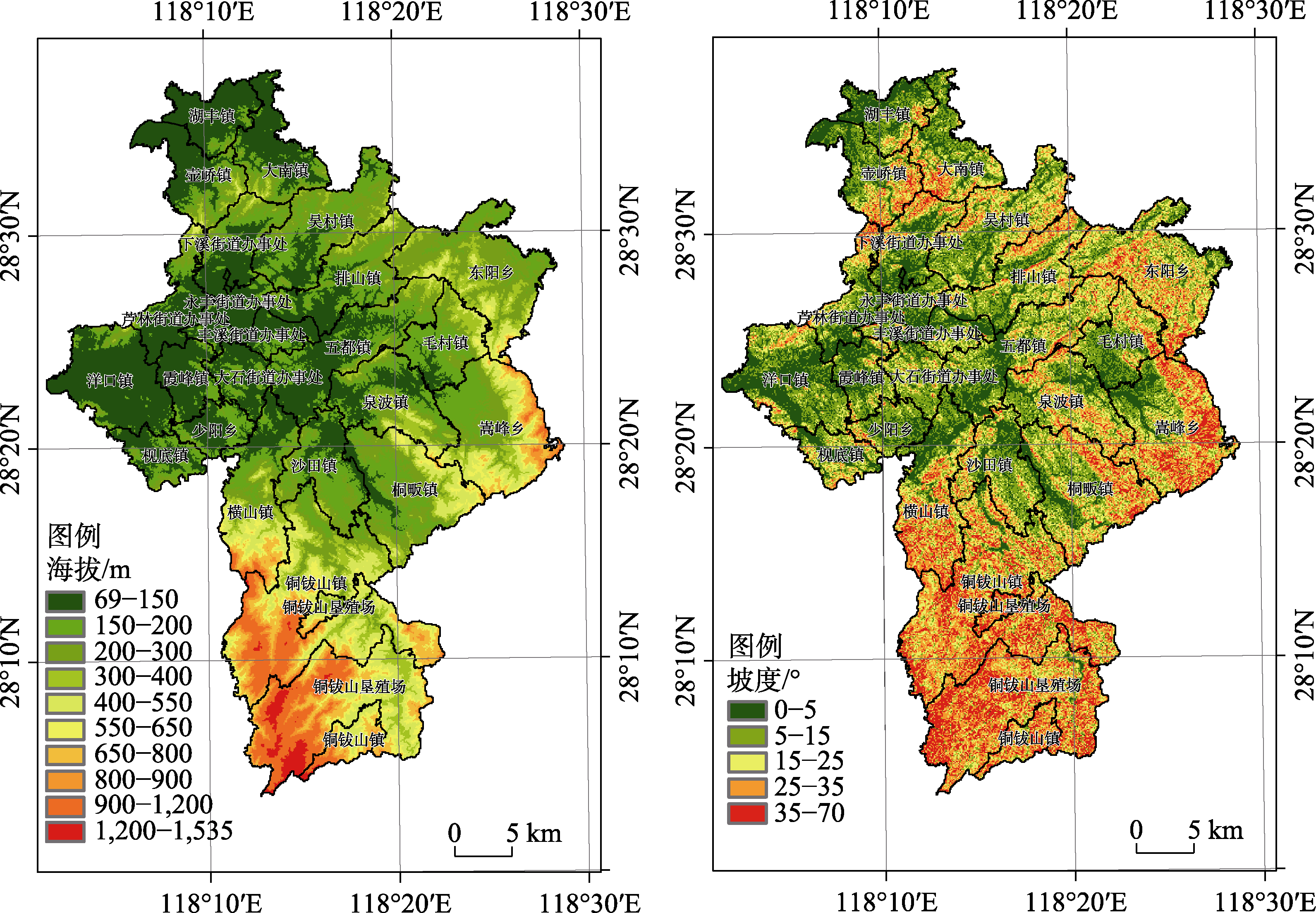 广丰地处武夷山北麓,属半丘陵半山区,整个地势从东南向西北渐次倾斜。东南部群山连绵,峰峦叠嶂,有海拔千米以上的山峰102座,铜钹山主峰海拔1,534.6 m;中部、北部和西部均属起伏丘陵,地势平缓,县城海拔95 m;区内最低处为西端和北端,海拔为72 m。地貌类型上,广丰区主要岩层为泥盆纪后期至下石炭纪初期的石英砂岩,区内分为侵蚀构造低中山—低山、构造侵蚀丘陵、风化剥蚀岗阜、侵蚀堆积河谷平原等地貌类型。位于广丰区南部的铜钹山,是中国丹霞面积最大的国家级森林公园,面积约占整个广丰区的四分之一[1–3]。利用DSM(AW3D30)数据,通过计算与分级处理获取广丰区海拔高度(图3)和坡度空间分布图(图4)。