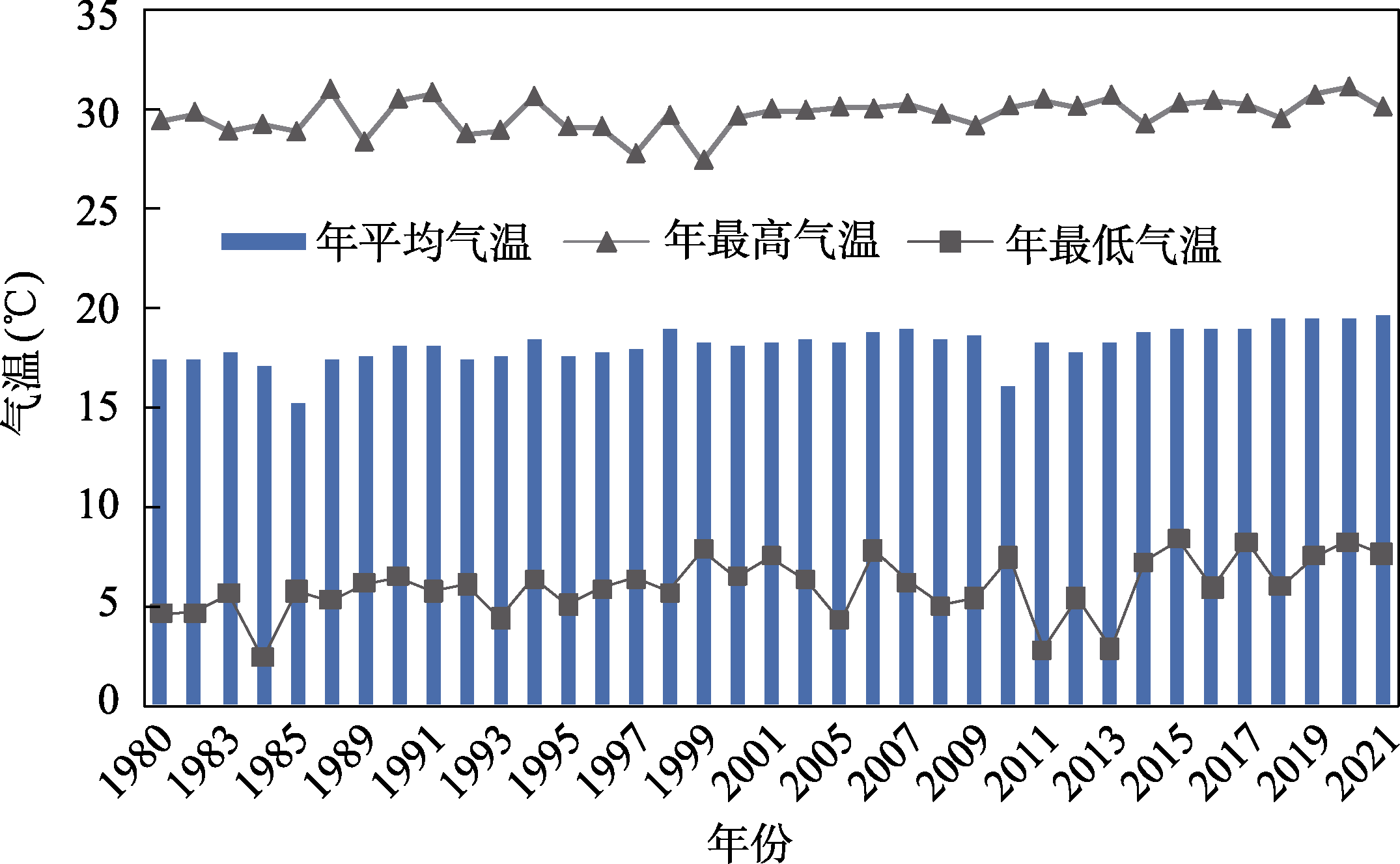 年内降雨季节变化显著,春夏多、秋冬少,降水空间分布差异明显,平原向山区递增,春末夏初为“梅雨”季节;多年平均日照时数1,733.82小时,光照分配较均匀,年总辐射量约108.7 kcal/cm2。1980–2021年气象数据显示(图5、6、7、8),广丰区内最冷月(1月)平均气温5.2 ℃,最热月(7月)平均气温28.59 ℃;过去40年,年平均气温呈增加趋势(1980年为17.37 ℃、2000年为18.13 ℃、2021年为19.69 ℃)[1–3]。