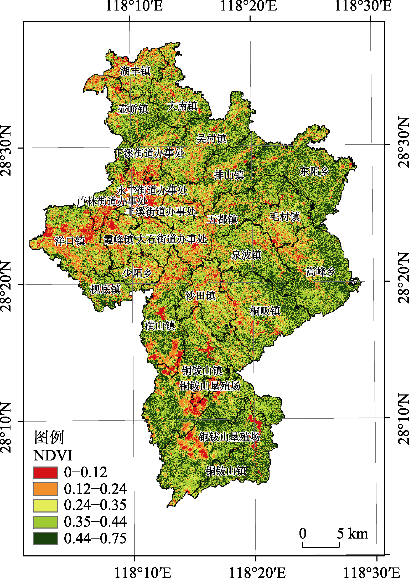 2020 年广丰区森林覆盖率达到62.05%,80%以上地区的植被指数大于0.25(由10 m 哨兵卫星遥感影像反演,如图9所示)。广丰区先后获评“省级森林城市”“省级绿色低碳试点县”,铜钹山国家森林公园、现代农业示范园分别被评为全省低碳旅游示范景区、江西省低碳农业试点产业园。