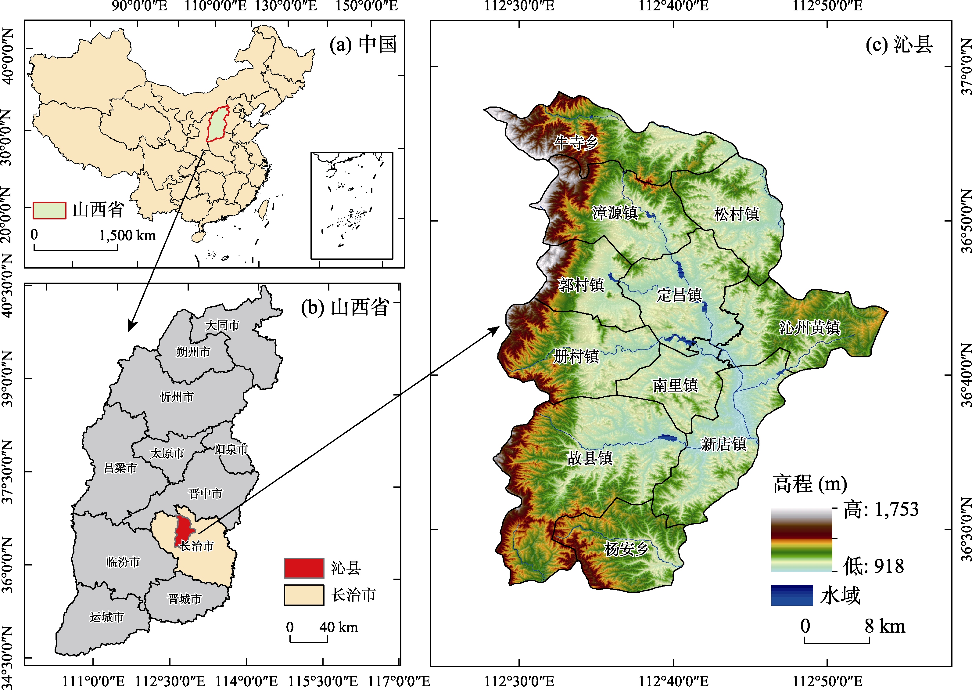 沁县位于山西省东南部,长治市北部,地处太岳山以东、太行山以西的丘陵区域,介于东经112°27′至112°53′,北纬36°25′至36°58′之间(图1)。沁县所处北纬的36°带,为世界公认的作物黄金生长带,水土优良、气候适宜,这一纬度带因能孕育出品质上乘的农作物而闻名。沁县东连武乡县、襄垣县,西毗沁源县,南接屯留县,北与武乡县及晋中市平遥县接壤。2024年,沁县辖定昌镇、郭村镇、新店镇、故县镇、册村镇、漳源镇、南里镇、沁州黄镇、松村镇、牛寺乡、杨安乡11个乡镇,东苑、西苑、西湖、育才、北关、南关6个社区居民委员会,218个行政村[19]。总面积1,320 km2,全县户籍总人口16.88万人[19]。