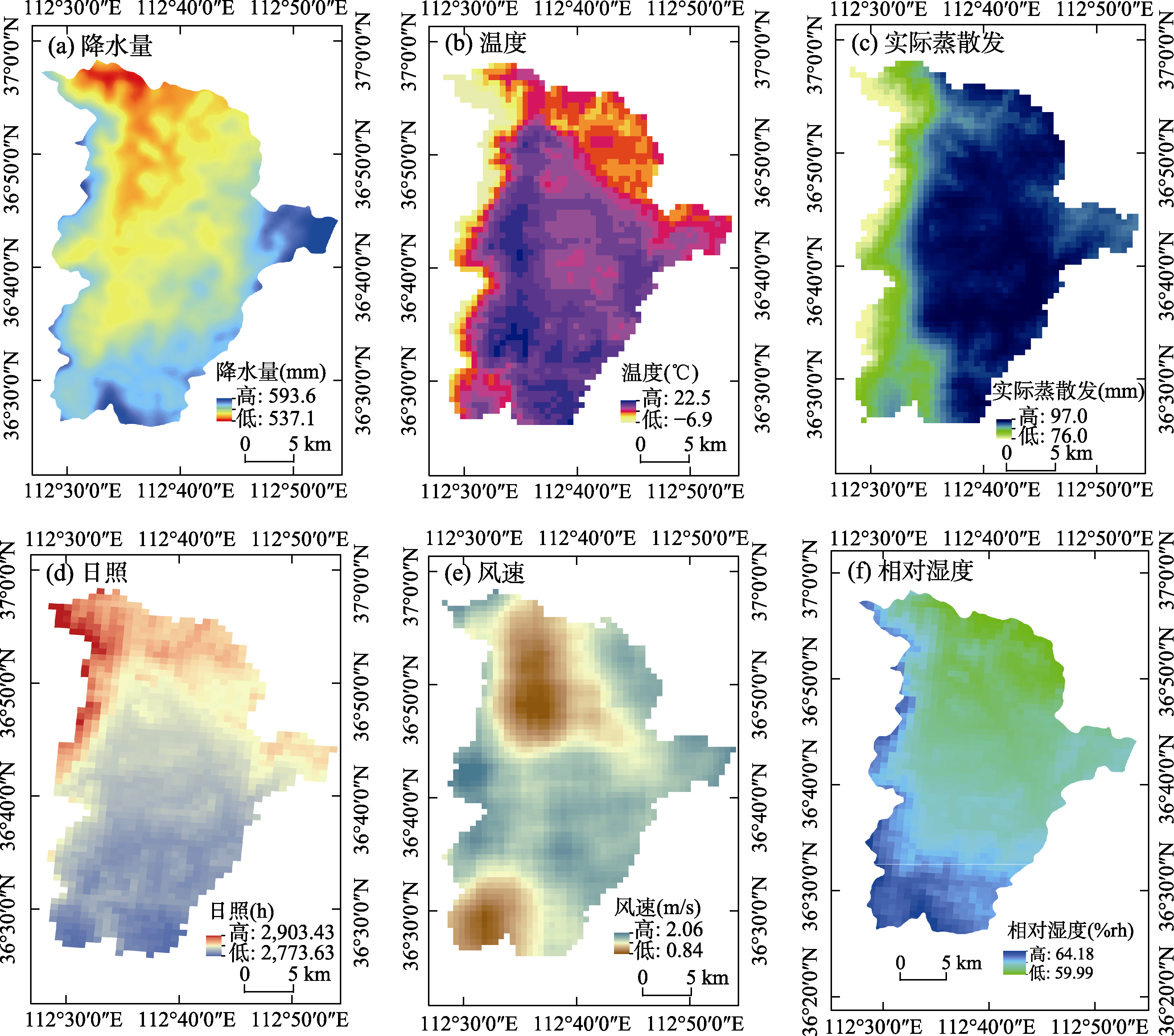 沁县属暖温带大陆性季风气候,春季干燥多风,夏季炎热多雨,秋季早晚温差大,冬季寒冷少雪,是喜温耐旱小米生长的黄金地带。基于沁县县情概况[19]和ERA5气候数据[2],沁县年均日照时数2,820 h,年均无霜期168 h,年均气温为9.3 ℃,最高月均气温22.5 ℃,最低月均气温–6.9 ℃,年均降雨量606 mm,月均实际蒸发量61.2 mm,年均相对湿度为11.2%,年均风速为1.5 m/s(图4),为沁县小米的种植提供了适宜的生境。