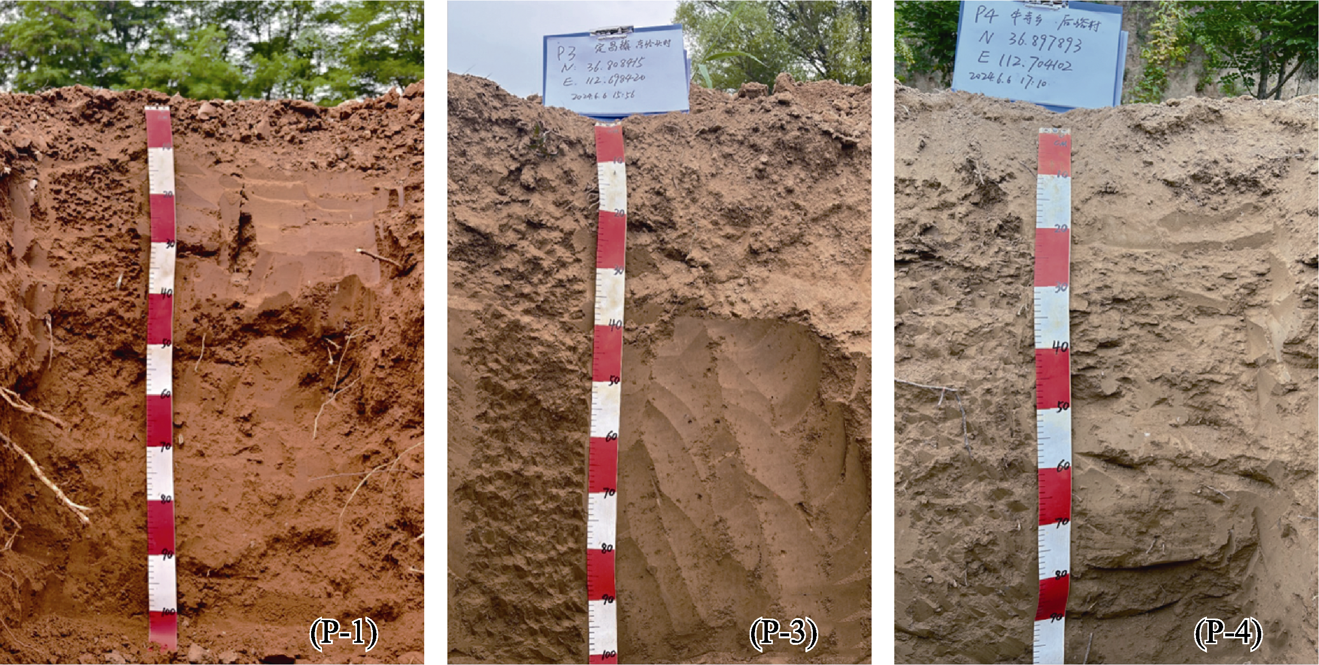为分析案例区深层土壤条件,本研究布设了9个土壤剖面采样点位(沁州黄镇、定昌镇、松村镇、漳源镇、牛寺乡、新店镇、杨安乡、南里镇和册村镇)。土壤剖面的标准尺寸为1.5 m长、0.8 m宽和1.0 m深。在挖掘土壤剖面时,应确保观察面朝向阳光,并将表土与底土分别置于两侧。需将剖面修平整,挑出部分毛面,并对其拍照记录(图7)。