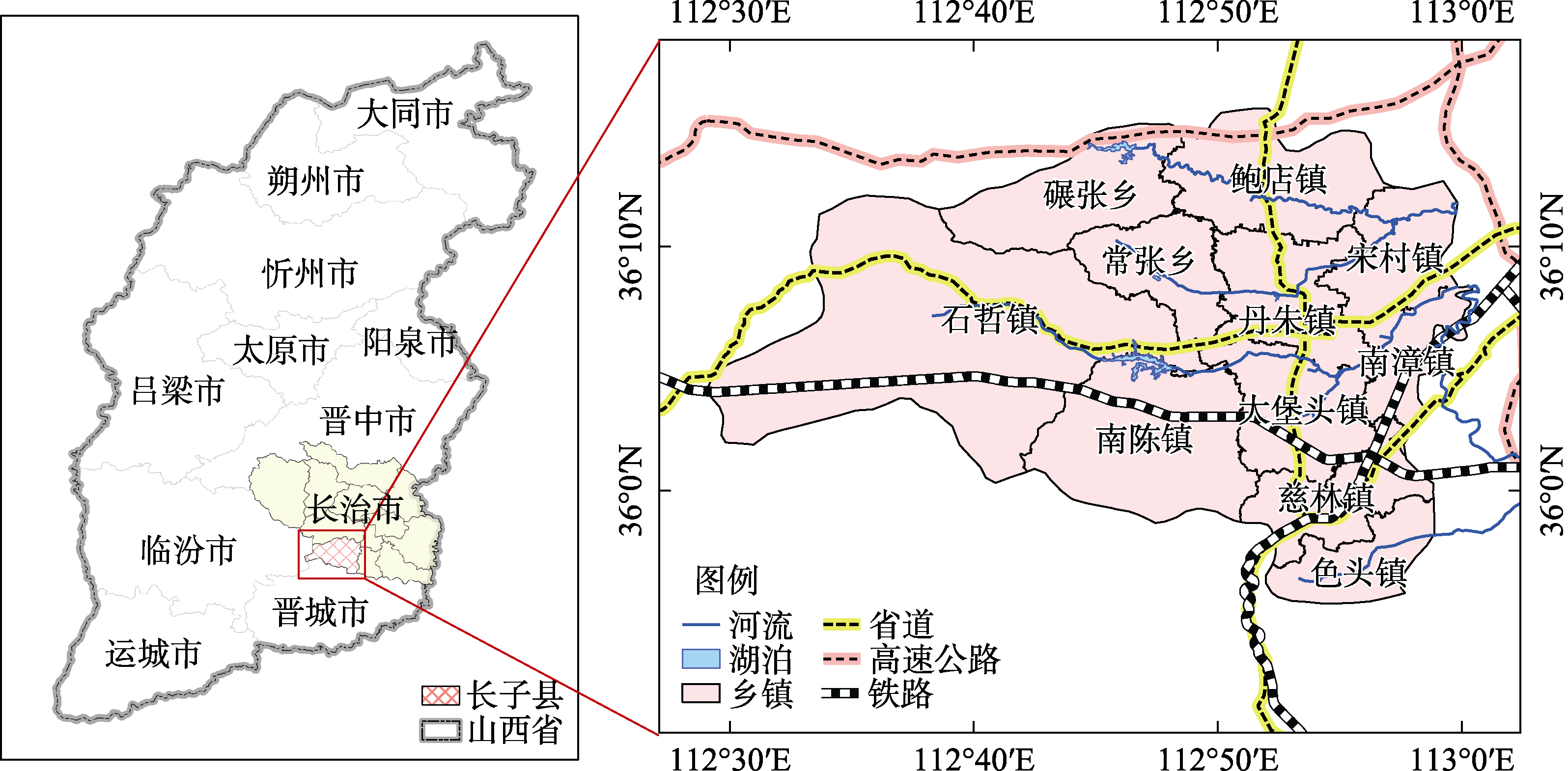 案例区为山西省长治市长子县全境(图1),位于北纬35°53′–36°15′、东经112°27′– 113°00′之间。全县总面积1,029 km2,常住人口29.87万[1],下辖丹朱、鲍店、石哲、南陈、大堡头、慈林、色头、南漳、宋村9个镇和碾张、常张2个乡。其中,石哲镇、南陈镇、大堡头镇、宋村镇等乡镇大规模种植以大青椒为主的露地和设施蔬菜。境内交通便利,县城距市区约20 km,太焦铁路、瓦日铁路、省道227、省道228、省道326和青兰高速穿境而过,为大青椒运输提供了便利条件。
