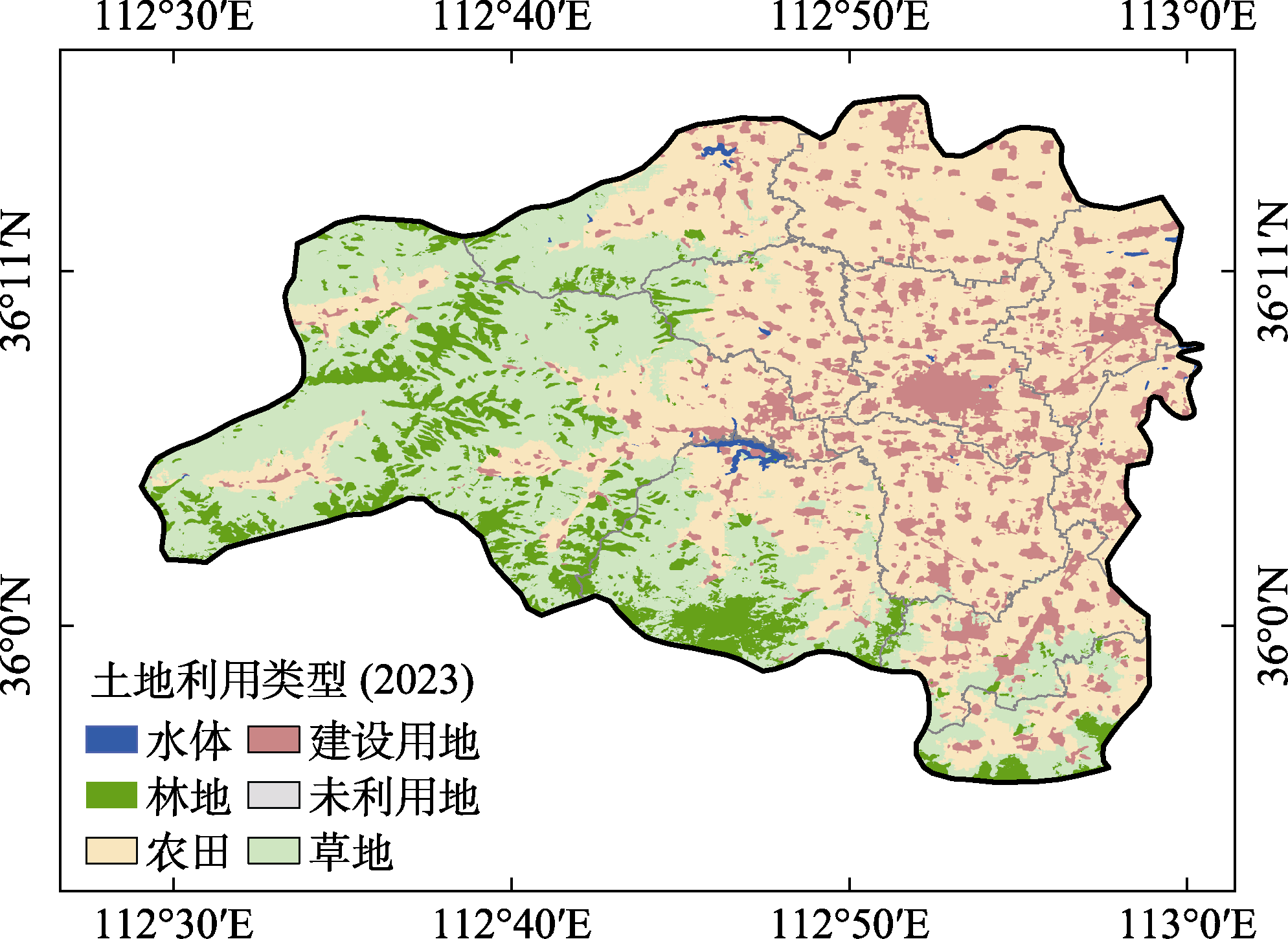 为揭示长子县土地利用和植被覆盖特征,作者基于Google Earth Engine(GEE)遥感数据处理平台,并利用去除云层影响的Sentinel-2卫星遥感影像[3]进行分析,获取了2023年长子县的归一化植被指数(Normalized Difference Vegetation Index,NDVI)及土地利用类型空间分布信息(图4、5)。结果表明,长子县土地利用类型主要包括农田、森林、草地、水体、建设用地等(表2、图5)。在空间分布上,农田面积最为广泛,约占全县总面积的一半,是农业生产和蔬菜种植的主要区域;其次为林地和草地,集中分布于西部及西南山区,总面积占比为39.57%。除城市建设用地外,绝大多数区域植被覆盖度较高(图4),NDVI值普遍大于0.5,显示出良好的植被生长状况。