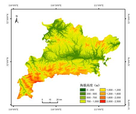 房县地势呈现西高东低、南陡北缓的特点,中部为河谷平坝。基于ASTER(Advanced Spaceborne Thermal Emission and Reflection Radiometer)地形数据[5]分析得出,房县海拔范围在160m到2470m之间(图2)。以青峰断裂带为界,北部山地海拔800-1000m,山脉走向以东西、东北或东南向为主,山背开阔,山顶呈垣状,其间分布有河谷盆地,是玉米、水稻、小麦、木耳的主产区。中部以马栏河谷为中心形成狭长断陷盆地,海拔400-600m,既是重要粮食产区,也是果木林园发展的主要基地[5]。南部为高山区,海拔多在千米以上,山势陡峻,是玉米、杂粮及用材林的主要产区。全县海拔差显著,最高点为西南部上龛关家垭(2485.6m),最低点为大木姜家坡(180m),相对高差达2306m。这种独特的地形地貌特征与气候条件的组合,为房县农业生产的空间分异提供了重要的自然基础[6]。