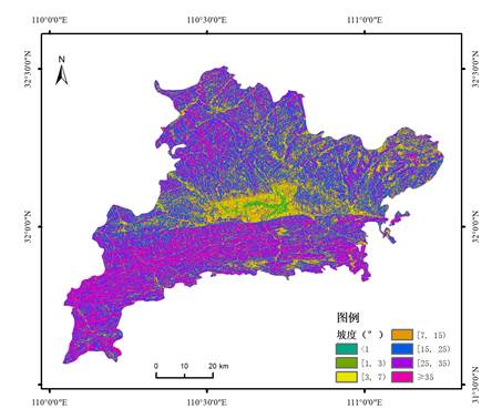 房县地形坡度呈现中间低、四周高的地貌特征,整体地势由中部河谷平原向周边山地逐渐抬升。这种地形格局主要受秦巴山区构造运动和汉江水系长期侵蚀切割的影响,形成了以房县盆地为中心、四周被中低山环绕的"盆状"地貌结构。中部地势相对平坦,坡度基本在15°以下(表3和图3),是县域内主要的城镇聚集区和农业耕作区;四周多为15°以上的山地,森林覆盖率高。
