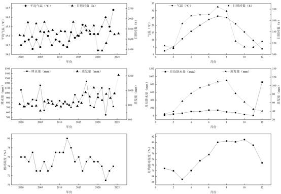 房县位于亚热带季风气候区,具有显著的立体气候特征。该地区冬长夏短,四季分明,气候垂差异显著。根据中国气象数据网房县站(2000年-2024年)[7],该区域年均空气相对湿度75.1%(图4),年平均温度15.0℃,年日照时数1376~1938小时,无霜期223天。年平均降雨量550.2~1237.0mm,降水集中在4-10月份,占全年降水量的86.3%,呈现由北向南递增的趋势。雨日在101~137天之间,年平均雨日121天。该地区主要农业气象灾害包括春季"倒春寒"、夏季"卡脖旱"以及秋季阴雨低温天气,这些因素对农作物生长构成显著影响。