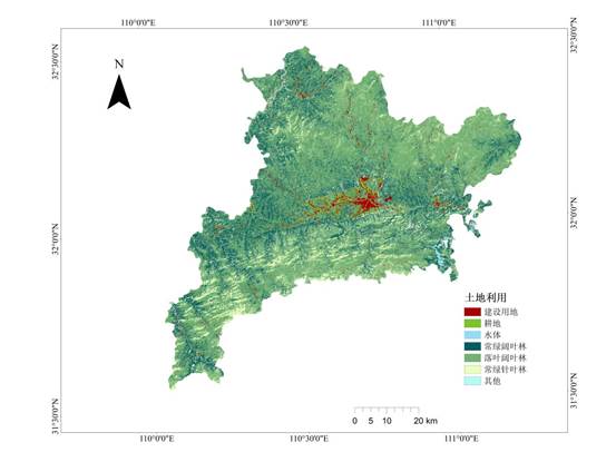 根据房县2022年Sentinel-2 L2A影像(云量<30%)[8],经云掩膜处理后合成12期月度中位数影像。提取特征包括10个光谱波段(B2-B8A、B11-B12)、4个植被指数(NDVI、NDWI、EVI、SAVI)及其年度统计量(中位数、均值、标准差、极值),利用随机森林算法进行房县土地利用分类(图5)。