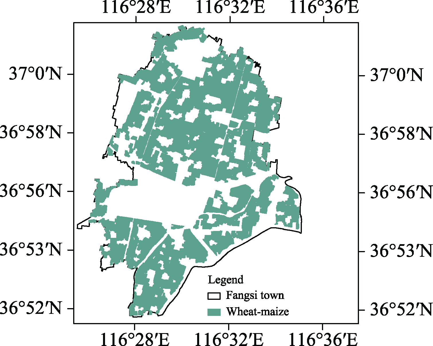 The case study area is located at Fangsi town. Fangsi is a town under the jurisdiction of Yucheng, Dezhou city (prefecture), Shandong province, with an area of 146.24 km2. Fangsi town has 11 communities and 123 administrative villages. The geographical scope is the farmland of wheat-maize in Fangsi town, with a total area of 63.96 km2 (Figure 1, 2).