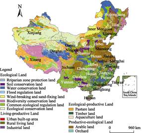 As the aim of this research is to document the multiple functions and main purpose of LAND USE, differences in socioeconomic development and productiveness, as well as in populated residential and ecological functions across different regions of China were synthesized. This enabled the identification and classification of land use functional areas in accordance with regional differences and the identification of national-scale ecological-populated residential-industrial lands. The main classification principles utilized were to initially highlight main land use function based on multi-functional considerations before emphasizing the importance of ecological land. This enabled focus to be placed on the spatially explicit locations of ecological-populated residential-industrial land.