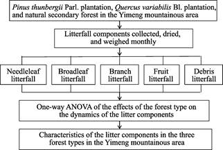 The technical route is shown in Figure 1. The experiment was carried out at the Tashan National Forest Park in Feixian county, Shandong province, China (35°10′N–36°00′N, 117°35′E– 118°20′E). We selected a total of 17 plots, including 6 in black pine plantation, 5 in oriental oak plantation, and 6 in natural secondary forest. A 1 m × 1 m sieve with a mesh size of 1 mm was placed in each plot, approximately 30 cm above the ground, to collect the litter. The sieves were placed from May 2015 to May 2017, and the litter was collected monthly. The litter was brought back to the laboratory, sorted into needleleaf, broadleaf, fruits, and debris, and then dried to a constant weight at 80 oC. One-way ANOVA was performed on the data using SPSS 16.0 software, to analyze the effects of the different forest types on the litter components.