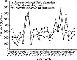Keywords: Pinus thunbergii Parl. Plantation; Quercus variabilis Bl. Plantation; natural secondary forest; litterfall; litter composition; litter dynamics; Acta Ecologica Sinica