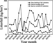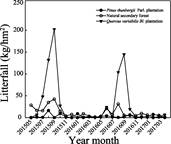 The data in this paper was obtained from in-situ field sampling. In November 2014, the research team conducted a survey on the vegetation of the state-owned Tashan Forest Farm in Feixian county, Shandong, and selected 17 sample plots with a similar land use history, good representativeness, and a forest age of about 40 years. GPS was used to record the latitude and longitude of the survey points and the vegetation type was also recorded. Litter frames were placed in the field to collect the litter, which was transferred to the laboratory every month. The litter was manually sorted in the laboratory and dried at 80 ¡æ to a constant weight, to obtain the monthly litterfall and litter composition of the three forest types. The results have a high reliability and can accurately reflect the litterfall and litter dynamics of the three forest types in the Yimeng mountainous region.