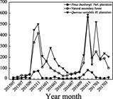 The litter dynamics of black pine plantation, oriental oak plantation, and natural secondary forest in the Yimeng mountainous region has the following characteristics. There were no significant differences concerning the total litterfall among the three forest types. The total litterfall of the three forest types in 2015 was 3,212 kg/hm2, 3,256 kg/hm2, and 3,368 kg/hm2, respectively, and that in 2016 was 3,295 kg/hm2, 3,838 kg/hm2, and 4,290 kg/hm2, respectively. The total litterfall of the three forest types showed a bimodal curve with the higher peak in October-November and the lower peak in April-May, whereas the minimum litterfall occurred at different times. In the black pine plantation, the minimum appeared in December, while the minimum occurred in July for the other two forest types (Figure 2[3]).