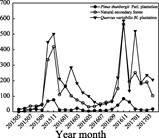 In this study, no significant differences were found concerning the total litterfall among the natural secondary forest, oriental oak plantation, and black pine plantation. This result is similar to the findings from most previous studies[6–8,11]. However, there are also different explanations for this[6–8,11], which are related to the composition of the plant communities, as well as their photosynthesis efficiency, niche differentiation, and productivity level[7]. The relative size of litterfall in natural secondary forests and plantation varies with climatic zones and forest types[3]. There are also different perspectives on the peak occurrence times and peak shapes of the litterfall in different forest types, which can be affected by environmental factors, such as forest type, climatic zone, elevation, and extreme climate[7,14–15]. Plant litter mainly accumulates in autumn and winter, with temperature being the main factor for the intra-annual variation of litterfall[3].