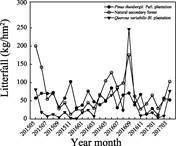 In situ dataset of monthly litterfall in the forests of Pinus thunbergii Parl., Quercus variabilis Bl. and natural secondary forest in Yimeng Mountain, China (201505–201704) |
