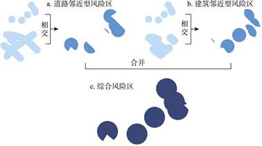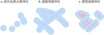 分析过程中以高压电塔点为中心,创建相应距离的点缓冲区(图 1a),确定高压电塔周边的高危地带作为高压电塔的风险区;分别对道路和建筑建立相应距离的线缓冲区(图 1b)和面缓冲区(图 1c),将高压电塔的风险区分别和道路、建筑的缓冲区相交(图 2a、图 2b),形成道路邻近型风险区和建筑邻近型风险区。将道路邻近型风险区和建筑邻近型风险区二者叠加,合并得到综合风险区(图 2c)。将3类风险区分别与行政区划相交,得到各行政区风险区的面积及其占比。最后与人口栅格叠加,利用空间统计方法得到风险区覆盖人口[25]。