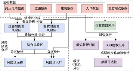 高压电塔风险区域及救援可达性空间分析过程主要以高压电塔数据、道路数据、建筑数据、消防站点数据为基础,划定高压电塔邻近风险区,计算消防救援时间以及可达性。分析过程的技术路线如图3,具体步骤如下:
