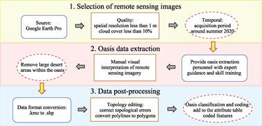 Although existing studies have proposed semi-automatic[14,15] or fully automatic[16,17] methods for feature extraction, these technologies still face challenges such as unstable classification accuracy and blurry boundaries when dealing with the spatial heterogeneity of internal vegetation types within oases (e.g., mixed distribution of different crop types, shrubs, and trees) and the morphological diversity of oasis boundary patterns (e.g., gradual transition zones along river edges, intermingled zones between farmland and desert). To ensure the consistency and high quality of the oasis boundary data, the visual interpretation method[18], combined with spatial validation in a Geographic Information System (GIS), was ultimately adopted to establish a rigorous technical workflow (Figure 1).