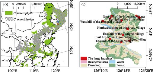 | Figure 6 Distribution of Corylus heterophylla and Corylus mandshurica in China (a) and cultivation of corylus in Futai town (b) |